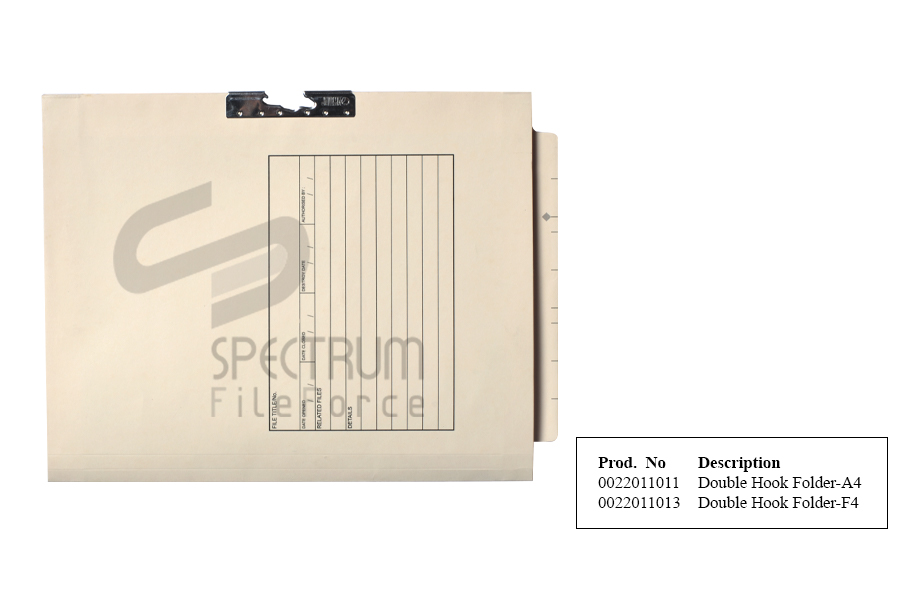 The most ideal way of filing where Double Hook Folder may be used for loose leaf files and punched files. Double Hook file comes with hook and SpectrumClip. Double Hook file has a cut tab that allows colour-coded indexing, with the colour labels, files can be easily and quickly identified. This is where the FileForce filing system works best !